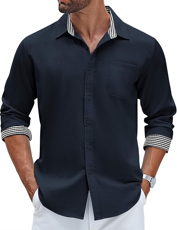 Men's Linen Button Down Shirt Long Sleeve Casual Beach Shirts with Pocket